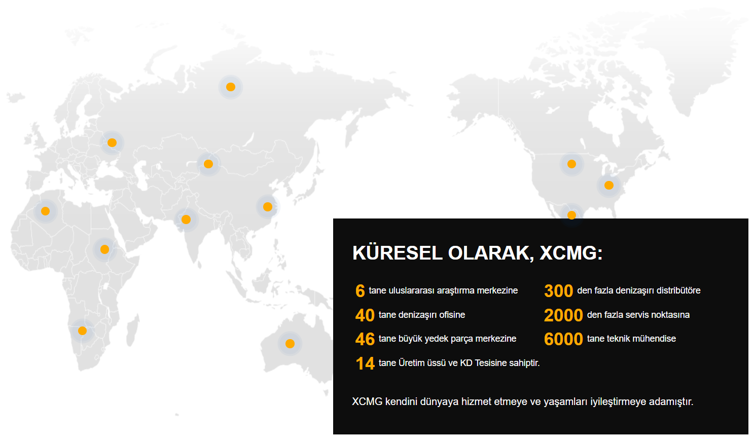 XCMG, küresel pazardaki sağlam ve istikrarlı gelişimi süresince, dünya çapındaki müşterilerine devamlı olarak tek elden, entegre, yüksek verimli ve uygun olarak satış öncesi, satış, satış sonrası ve finansman hizmetleri sunmaktadır. 183 ülke ve bölgeyi kapsayan 2.000‘den fazla servis terminali, 6.000‘den fazla teknik uzman ve 5.000‘den fazla pazarlama ve satış servis personelinden oluşan bir pazarlama ağı kurmuştur.